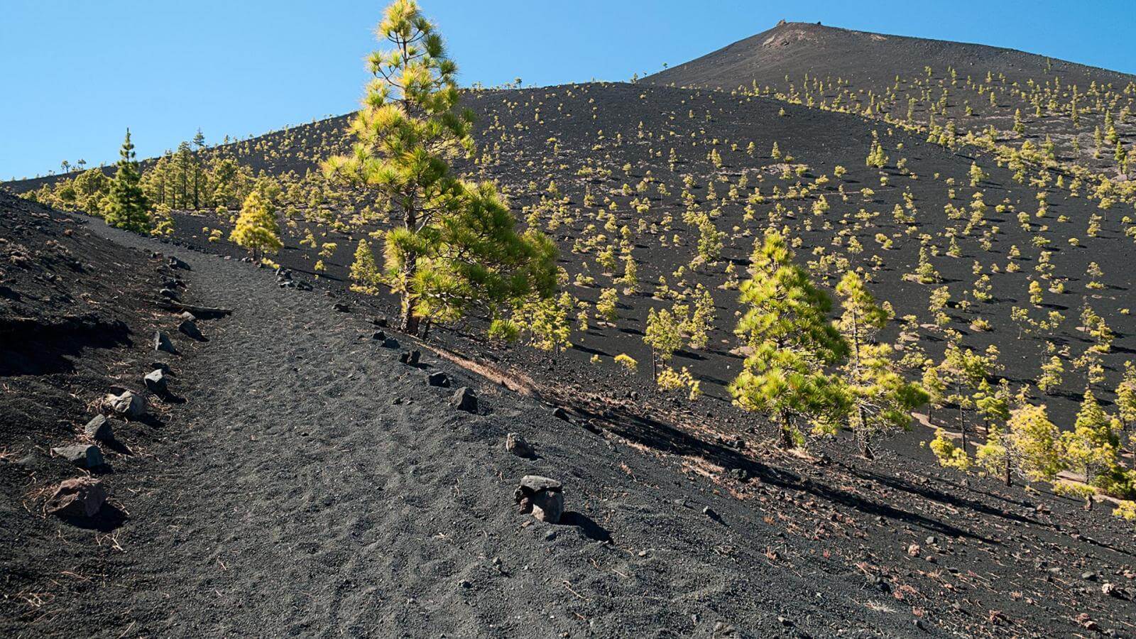 Enjoy a guided hiking route in front of a stunning volcanic landscape. This is at 1400m. The bright yellow colour contrasts with the green of the Canary Pine and both are enhanced by the dark volcanic landscape.